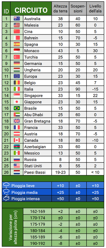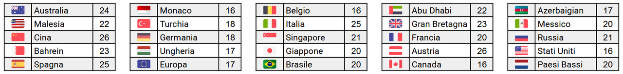 Sul sito non è possibile inserire le coordinate geografiche delle varie piste, ma solo dei nomi di città, pertanto potrebbero apparire delle differenze rispetto al meteo mostrato in iGP. I link qui sotto sono quelli delle località più vicine alle piste che io sia riuscito a trovare, e che ho riportato in parentesi quadre [...].