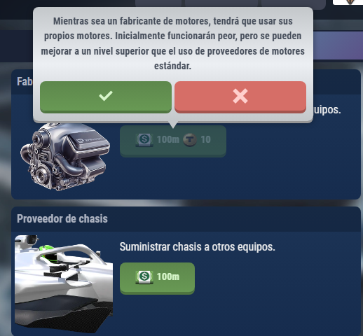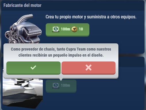 Hola, he leído en foro, que el chasis el cual nos ha costado 100m no lo utilizamos nosotros, que solo lo vendemos, y que hay escuderías que están perdiendo dinero por haberse puesto como vendedor de chasis, no se porque nosotros no podemos utilizar nuestros chasis, porque hay que comprar otro chasis que configura otro manager, pero si es así, eso se debería haber dicho a la hora de comprar el chasis, igual que se debería haber dicho que esa acción es irreversible, cosa que en ningún momento se avisa, tanto como en el chasis, como en el motor, que a principios de ser fabricantes se decía que al aceptar te decía que eso era irreversible, cosa que he comprobado por otro manager de la liga que me ha mandado capturas y no es cierto. Así que si yo no voy a utilizar los chasis que suministro, que si no hay mejoras durante las carreras en el chasis a no se que tenga clientes, quiero que esta opción sea reversible en mi caso, ya que no se ha informado bien de nada.