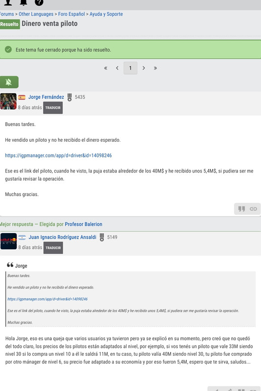 Ya son muchos errores, primero que vendes un piloto de máximo nivel y, si lo compra un novato te j***s (fastidias), pues igual un mánager sin nivel adecuado no debería de poder comprar pilotos/staff de tanto nivel (como toda la vida) porque no es justo para el equipo que vende. Que por cierto, publiqué el error y me ha contestado (muy amablemente) un mánager que no sé si es de staff o no y se ha cerrado el tema como solucionado, genial la solución, lo pago yo, MARAVILLOSO!
