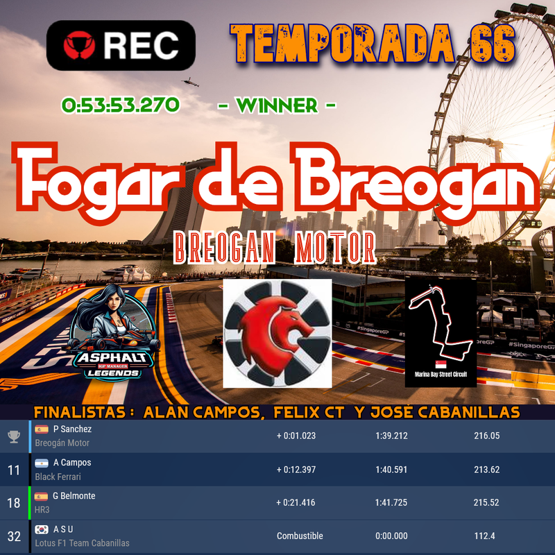 Vuelta a vuelta, la noche de Singapur se convirtió en un tablero de ajedrez. Las paradas en boxes alteraban el orden, los adelantamientos se sucedían y la tensión crecía con cada relevo de neumáticos. Fogar de Breogan, saliendo desde el fondo, fue ganando posiciones hasta situarse en la pelea real por la victoria, demostrando sangre fría y una lectura perfecta de la carrera.