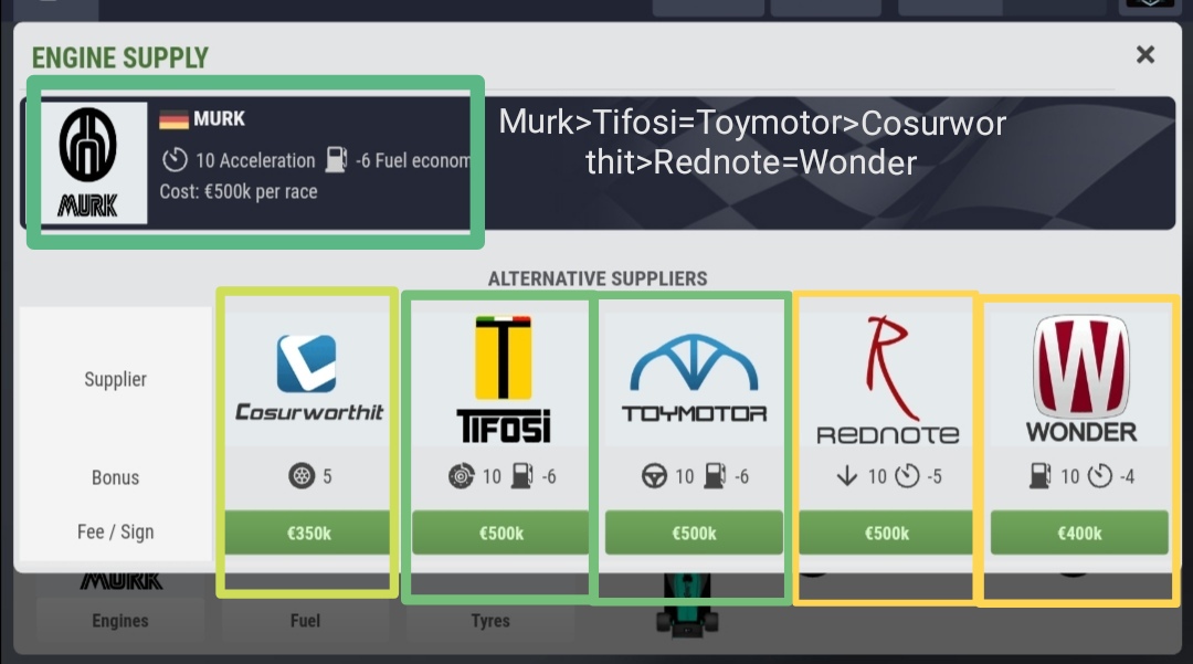 The cheapest choices are cosurworthit (engines) , chavon (fuel), komehome (tyres), however this choices will not give you the best bonuses as some other most expensive options. Use them in the end of the season when promotion or the title is already over